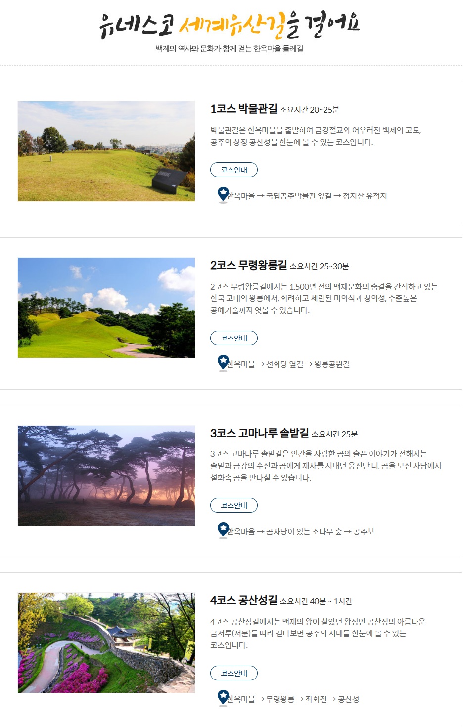 첫 번째로 추천하는 곳은 공주 한옥마을입니다. 이곳은 전통 한옥과 아름다운 경관이 어우러져 한국의 전통 문화를 체험할 수 있는 곳입니다. 특히, 공주를 방문하면 유네스코 세계 유산길을 따라 걷는 코스를 즐길 수 있습니다. 이 길은 백제의 역사와 문화를 느낄 수 있는 아름다운 경치를 자랑하며, 부모님과 함께 걷기에 안성맞춤입니다. 길을 따라 펼쳐진 전통 한옥과 자연의 조화는 특별한 경험을 선사할 것입니다. 부모님께서는 한옥의 아름다움과 전통 음식을 즐기며 행복한 시간을 보내실 수 있습니다. 주차 공간도 넉넉하게 마련되어 있어 편리하게 이용할 수 있습니다.