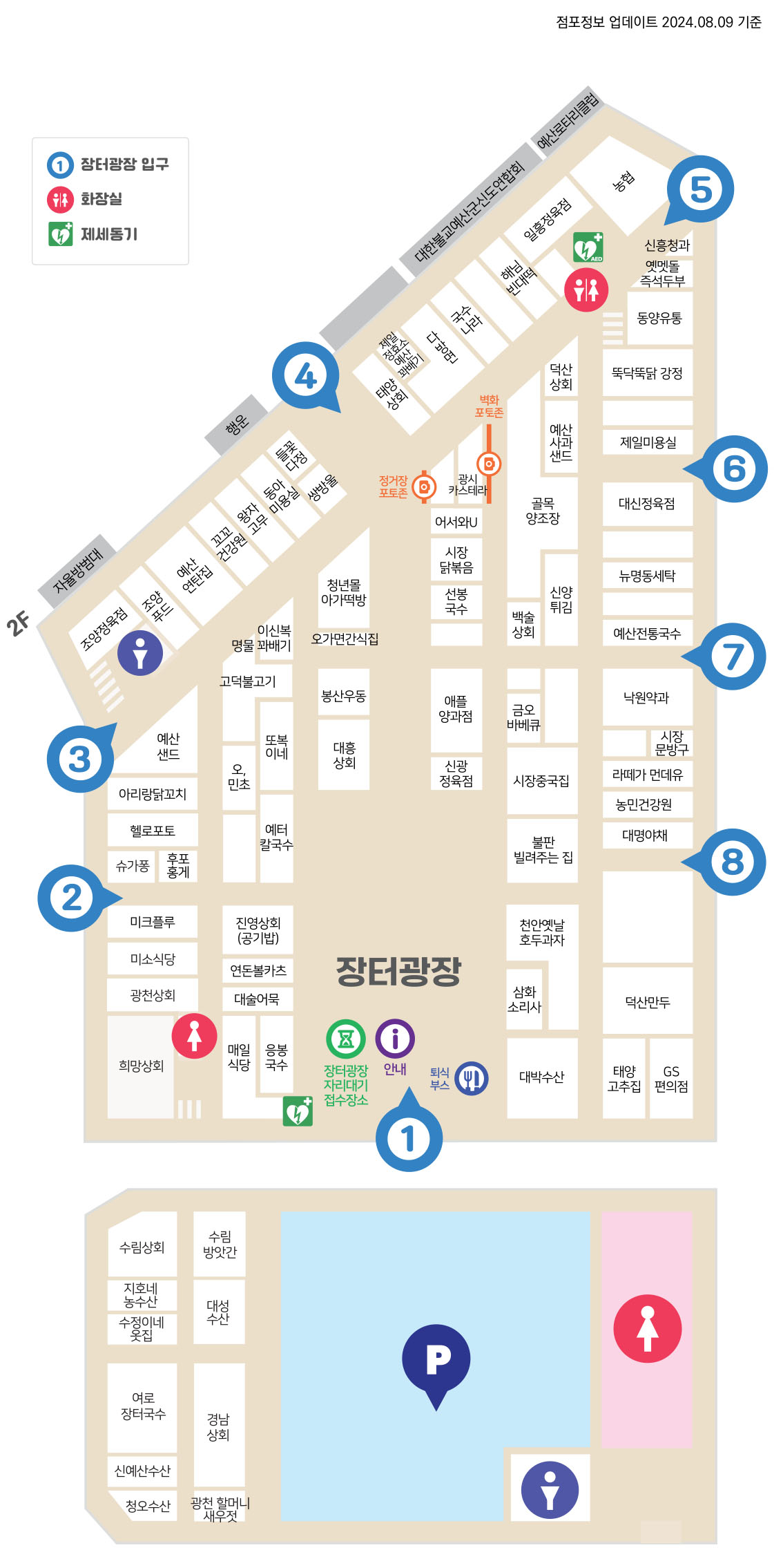 예산시장에서는 다양한 음식과 특산물을 즐길 수 있습니다. 특히 장터광장에는 여러 음식점과 포토존이 마련되어 있어 방문객들에게 특별한 경험을 제공합니다. 시장 내 매장 소개와 위치 안내는 공식 홈페이지에서 확인할 수 있습니다.