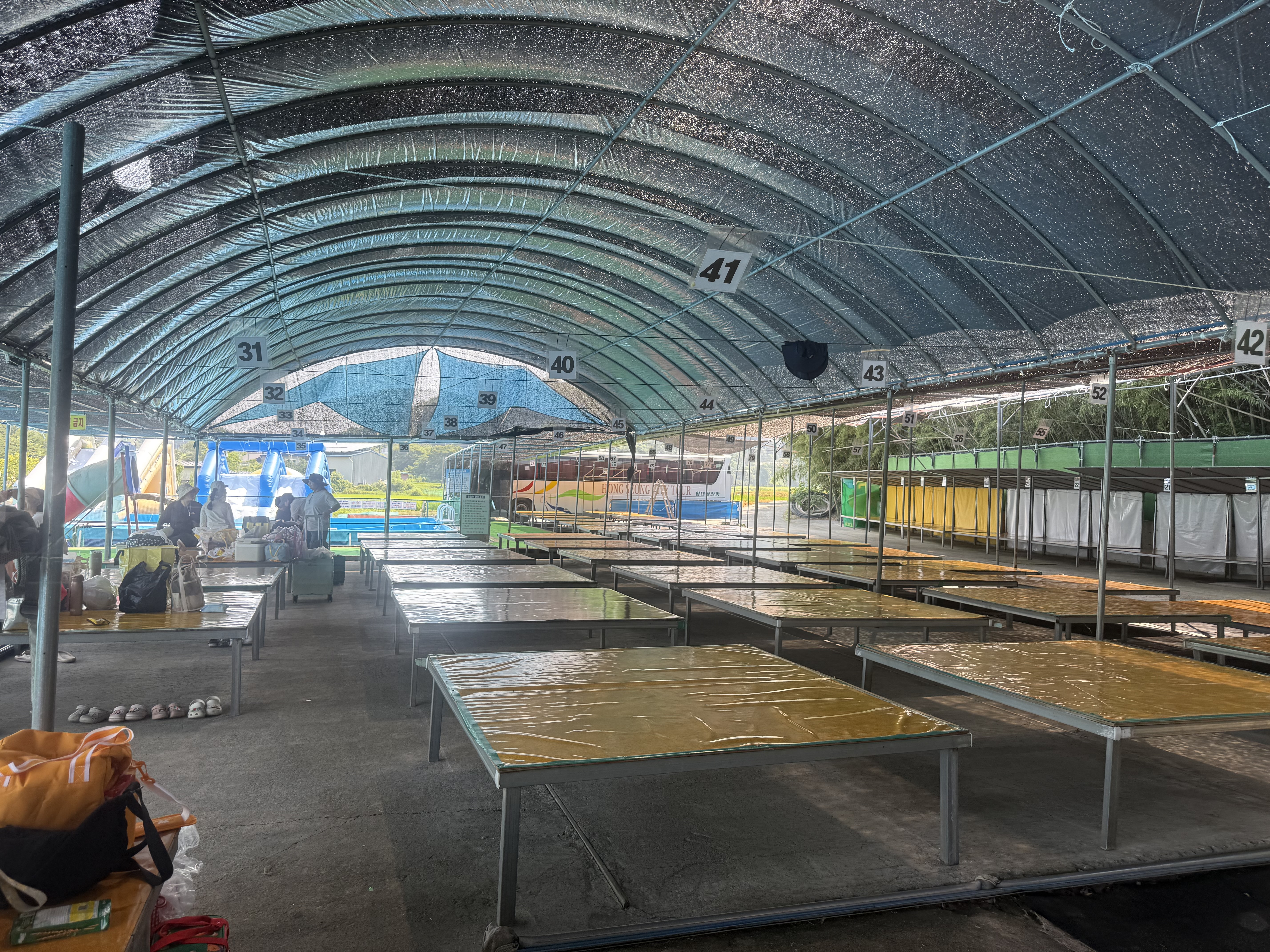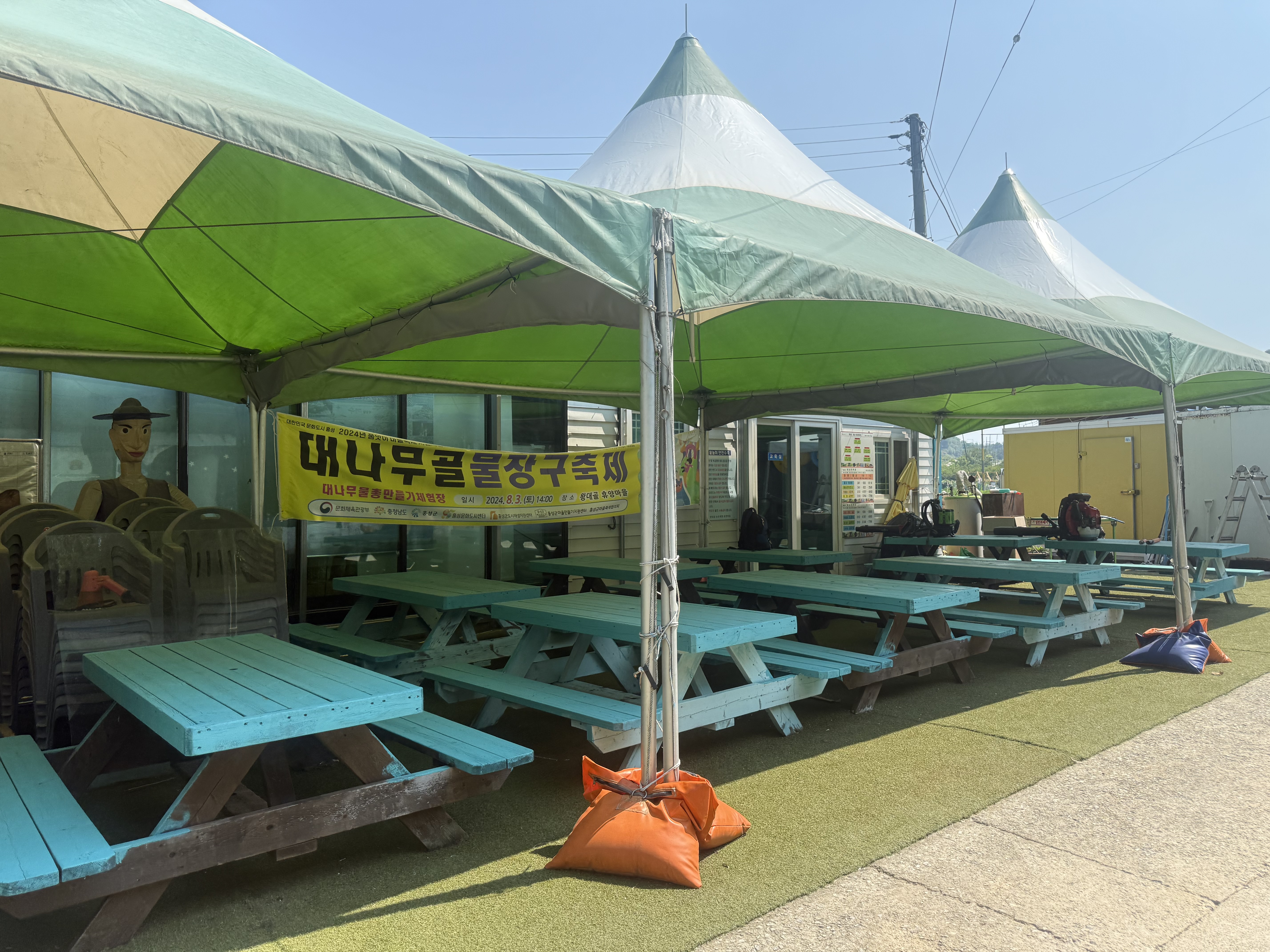 - 넓은 천막 아래 평상들이 번호별로 정리되어 있어요.